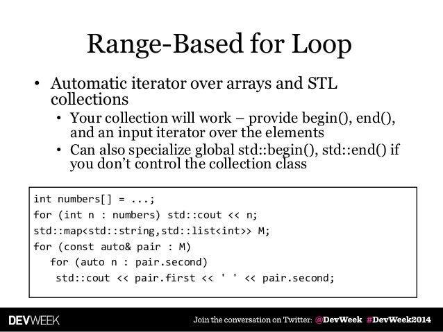 To show the difference between iterating using STL iterators and using for ranges. C++ in all its splendor:. The only item missing is the baseline when not to use automatic type deduction at all.